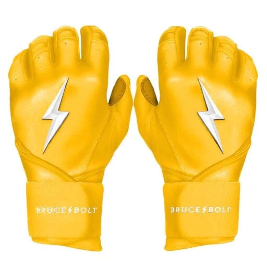 Each pair of Bruce Bolt Premium Pro Long Cuff Yellow Batting Gloves are handmade by skilled craftsmen using only the highest quality 0.9mm Cabretta leather and stitching techniques which makes Bruce Bolt gloves buttery soft but more durable than any other glove on the market.