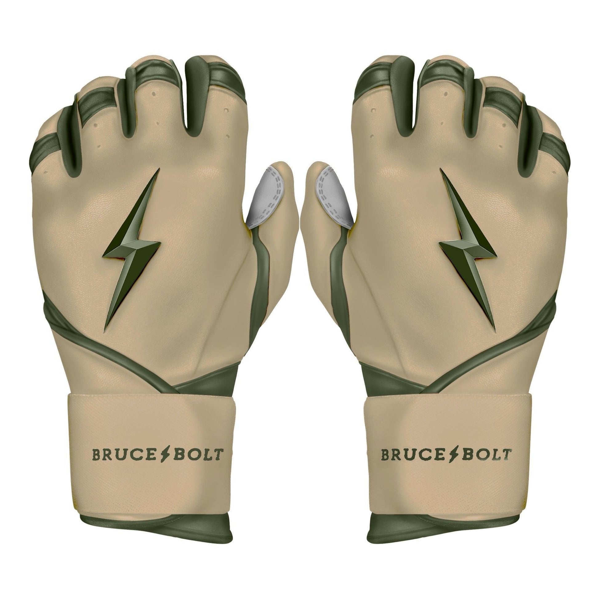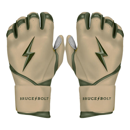 Each pair of Bruce Bolt Premium Pro Long Cuff MILITARY Series Batting Gloves are handmade by skilled craftsmen using only the highest quality 0.9mm Cabretta leather and stitching techniques which makes Bruce Bolt gloves buttery soft but more durable than any other glove on the market.