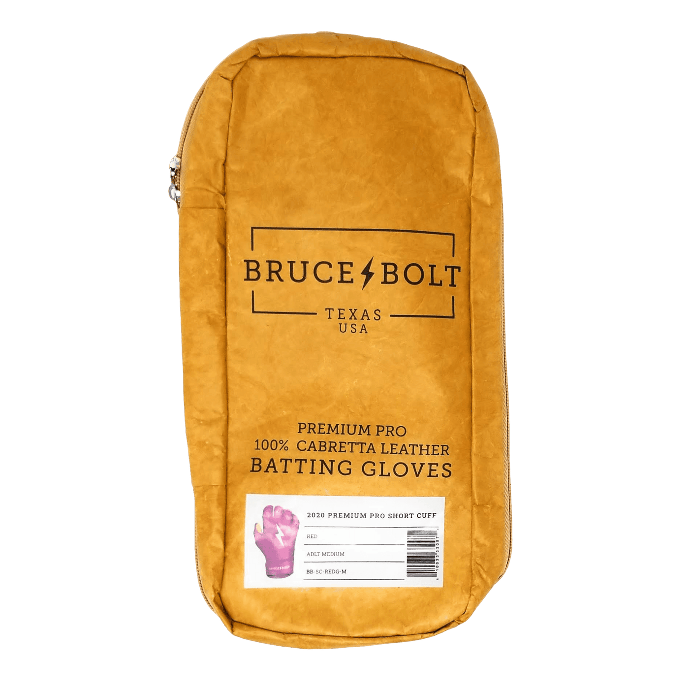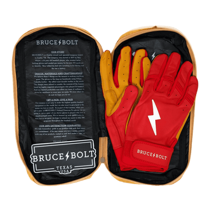 Each pair of BRUCE BOLT Red batting gloves are handmade by skilled craftsmen using only the highest quality 0.9mm Cabretta leather and stitching techniques which makes Bruce Bolt gloves buttery soft but more durable than any other glove on the market.