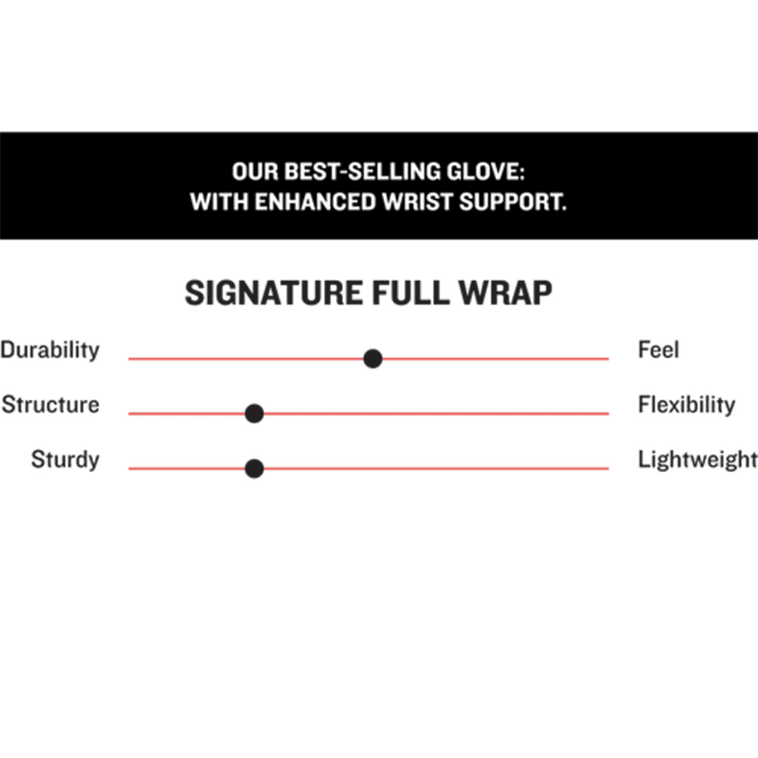 The Signature Full Wrap Batting Gloves are designed with digitally embossed, perforated cabretta sheepskin palm, finger break contours to decrease bunching between the fingers for a smoother fit and more comfortable grip, and a fully wrapping wristband for enhanced structure and support.