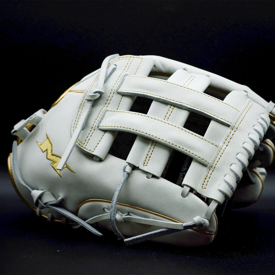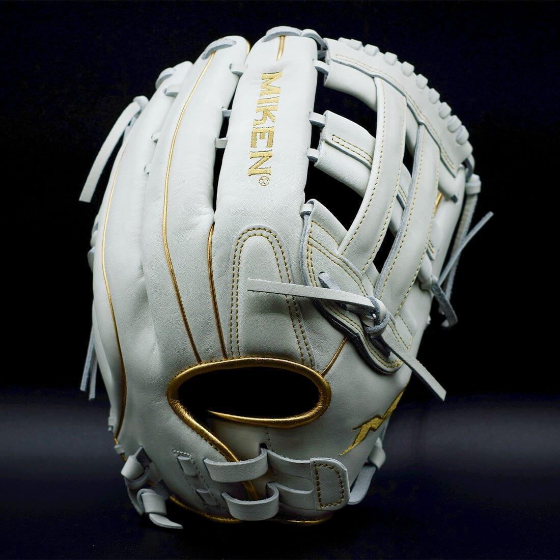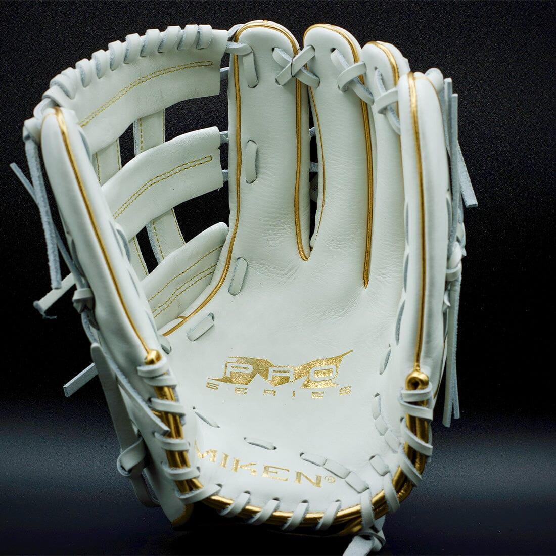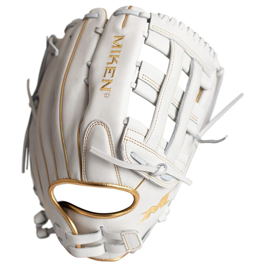 The brand new Miken Gold Pro Series 13.5" white slowpitch softball glove features the Pro H Web pattern, which is an extremely strong web that provides ball snagging functionality. This softball glove has a lightweight, soft, full-grain leather shell for a game-ready feel. Additionally, the PORON XRD palm padding has been added to drastically reduce ball impact to your hand. To cap it off, the unique black and gold design adds the perfect touch of style to this 13.5-inch Gold Pro Series gloves. Order today!