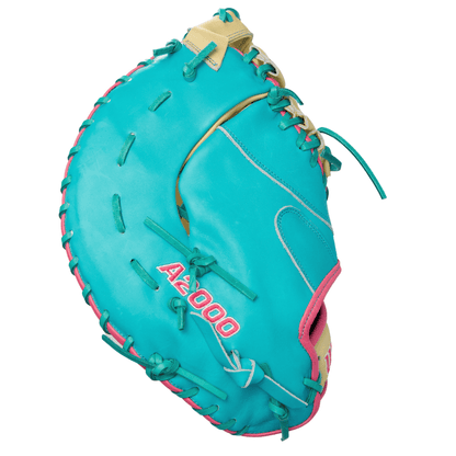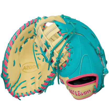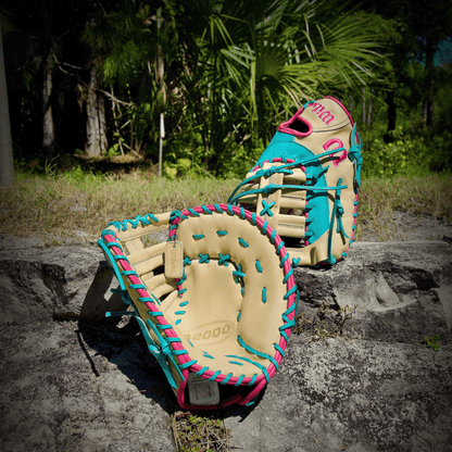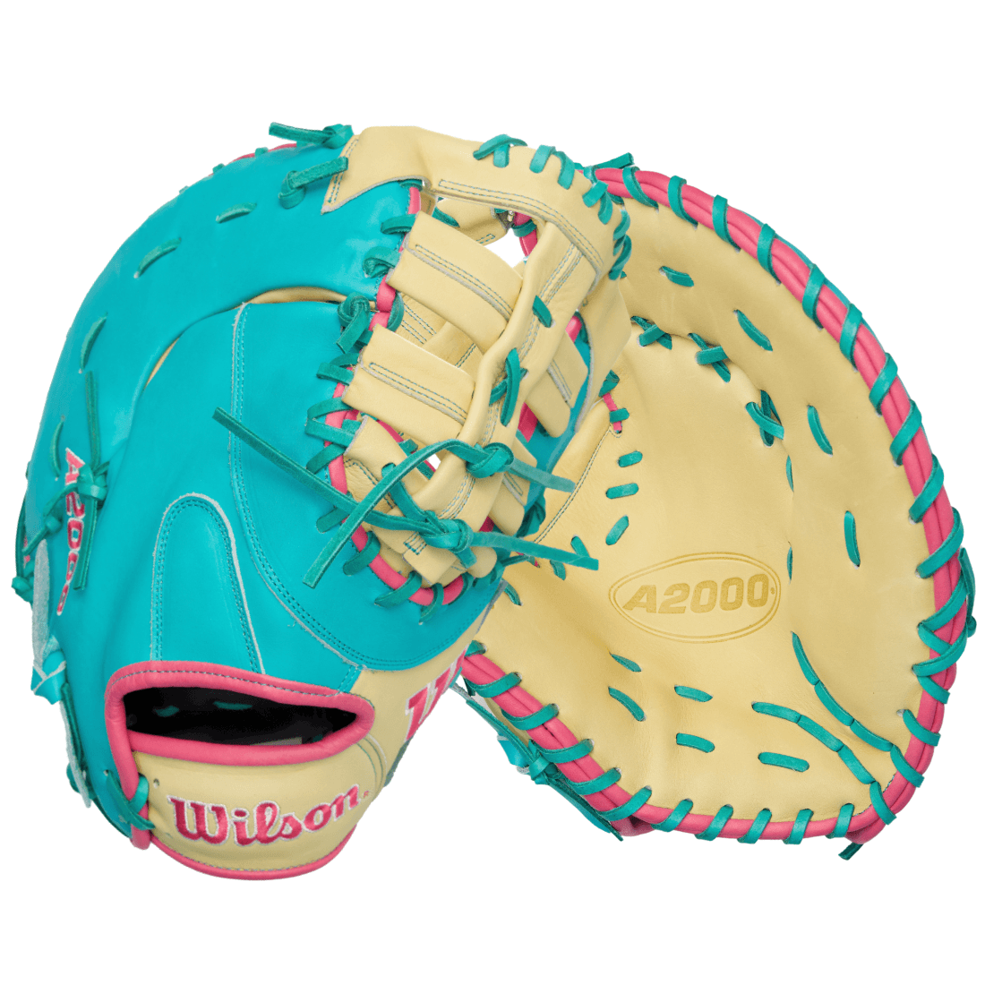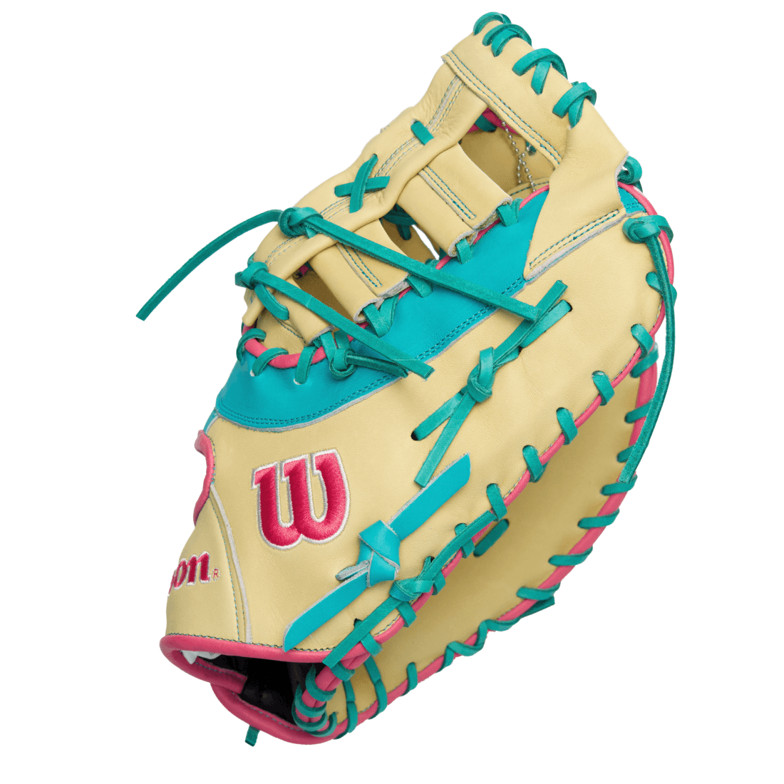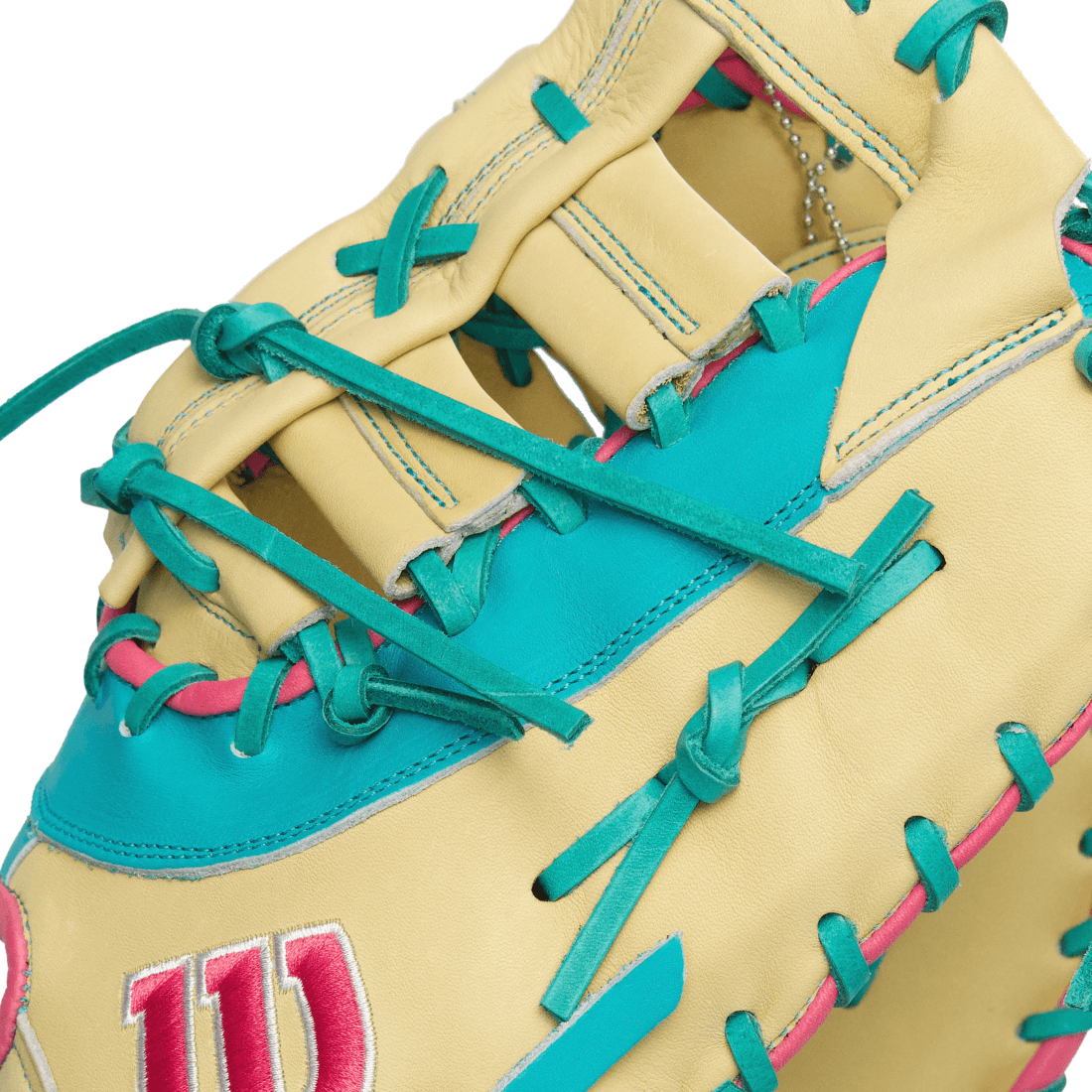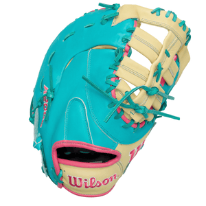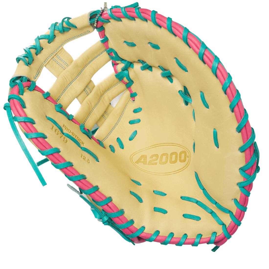Stand out on the field and dominate first base with the Wilson A2000 1679 LE 12.5" First Base Mitt in Blonde/Teal – a Headbanger Sports Exclusive designed for players who demand style and performance. Crafted with Wilson’s legendary Pro Stock® leather, this mitt offers unmatched durability and a buttery-smooth feel, while Teal laces and accents add a bold pop of color. The reinforced single-post web and deep pocket ensure secure scoops and lightning-fast transfers, making every play look effortless. Whether you're digging out low throws or flashing leather on tough plays, this glove is built to perform at the highest level.