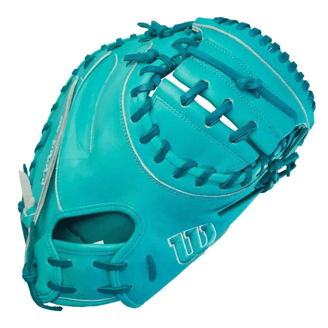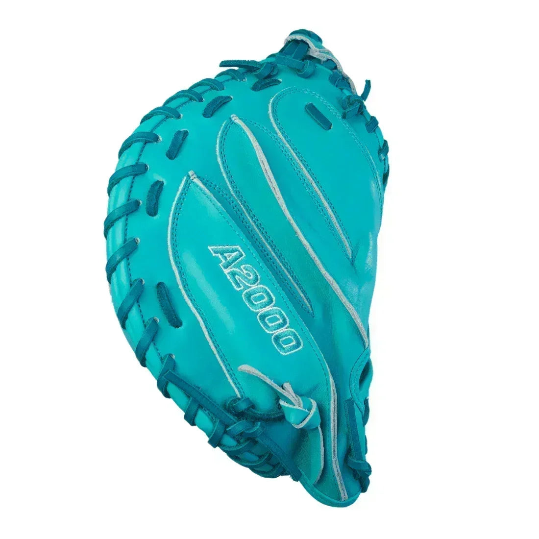 Introducing the Seabreeze limited edition Wilson A2000 catcher's mitt. This model is crafted with Teal Wilson Pro Stock leather, this 33-inch mitt features an exclusive design with our most popular CM33 glove catcher's mitt pattern. This pattern offers a 33" circumference, single-break design, and deep pocket.