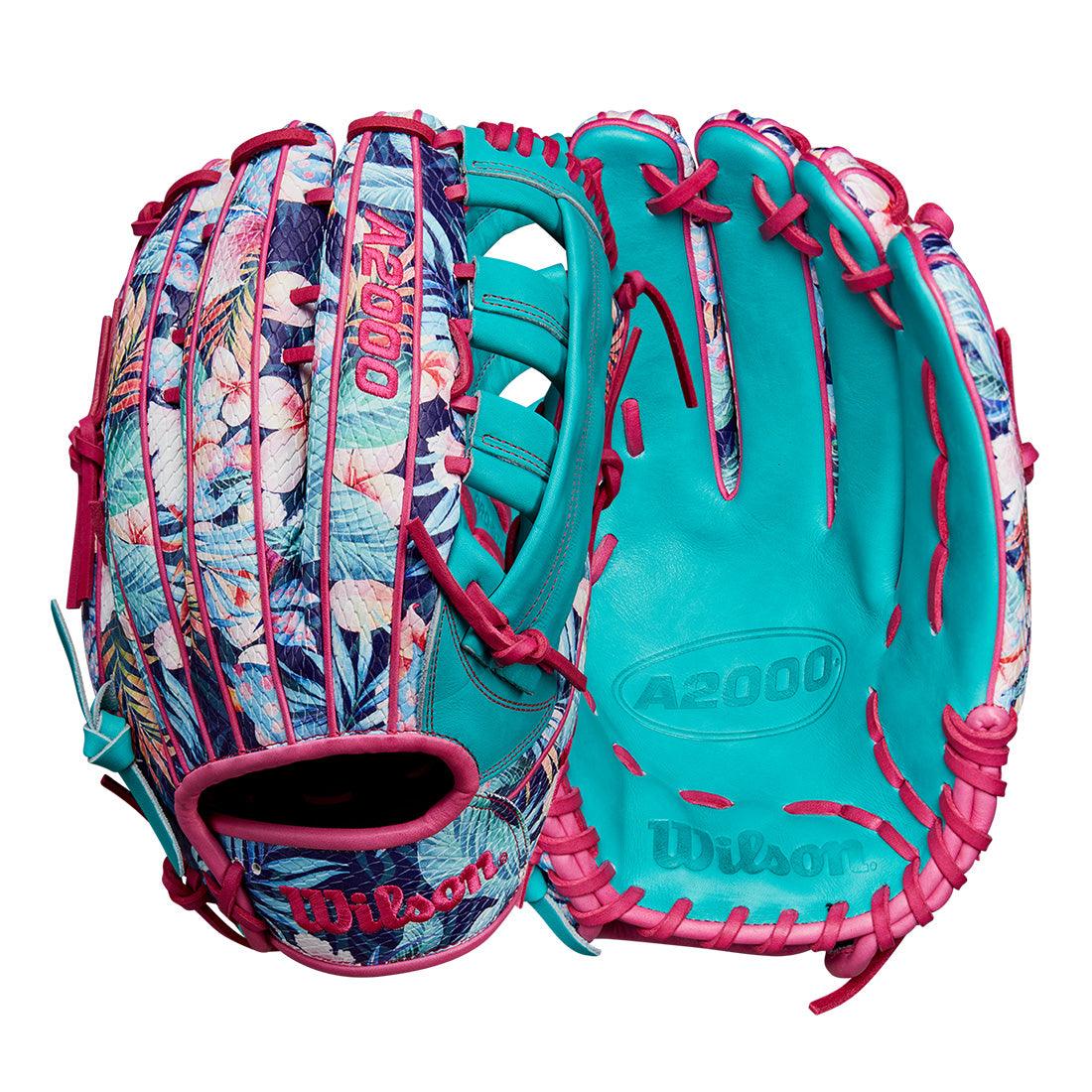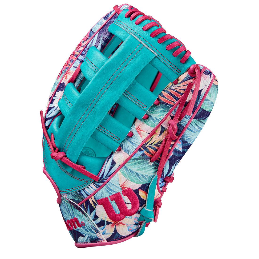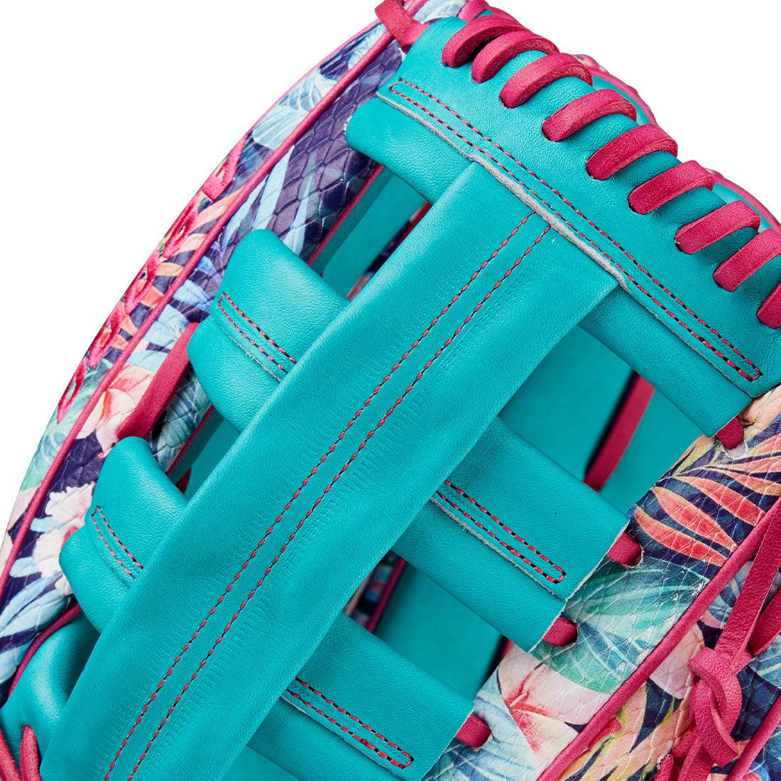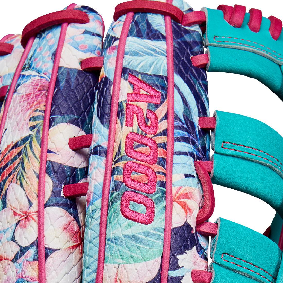 Match the coolest player on the field while making jaw-dropping catches at the wall with Randy Arozarena’s A2000® RA56 Game Model glove. Featuring SuperSnakeSkin™ decorated in a floral print, Arozarena’s A2000 delivers a lightweight feel and tropical vibe. This 12.75” outfield glove, based on the A2000 1806, has a Teal Pro Stock® leather palm for long-lasting performance. Blossoming high school and college outfielders can leverage the Single Post & Double Bar Web to rob home runs like Randy in the Pacific Northwest.