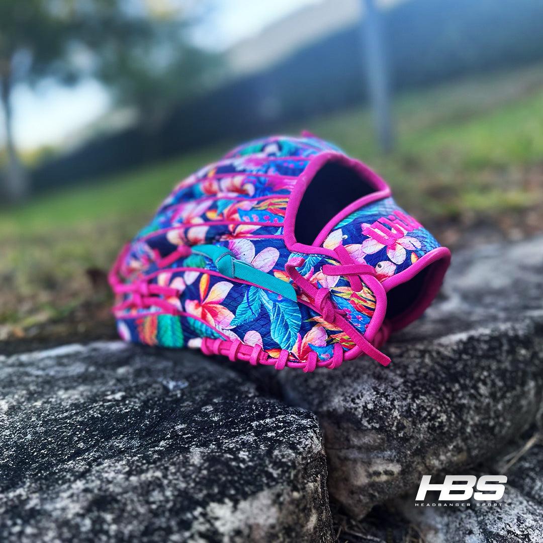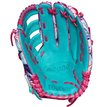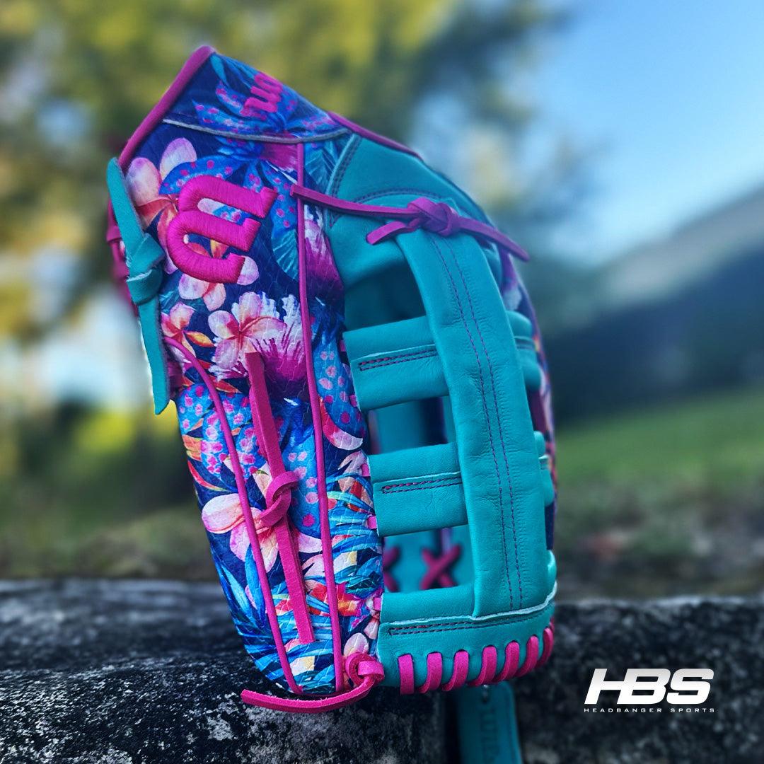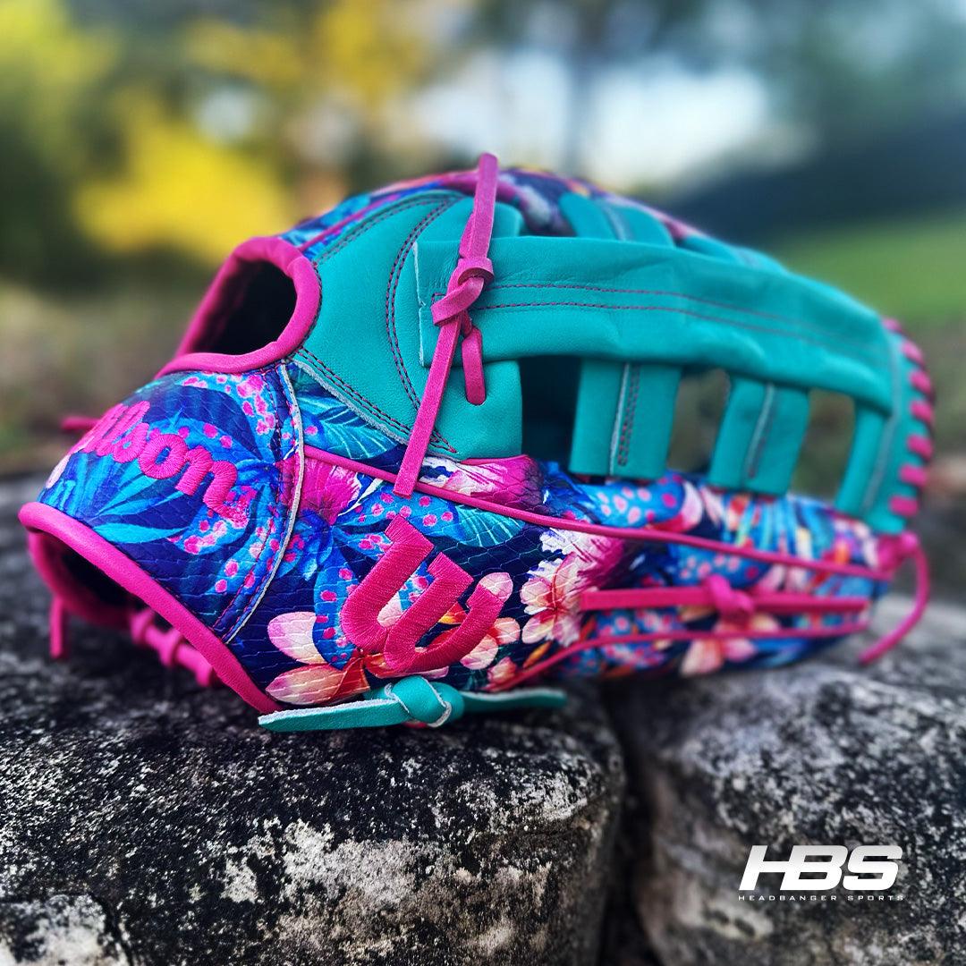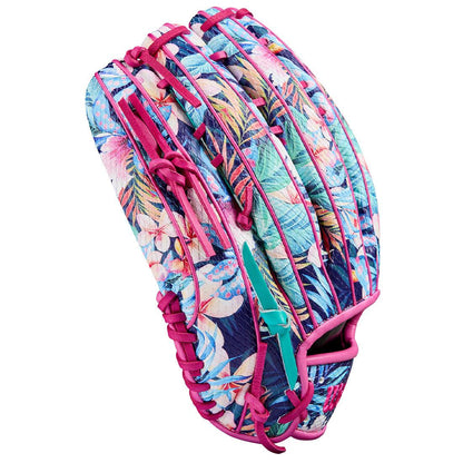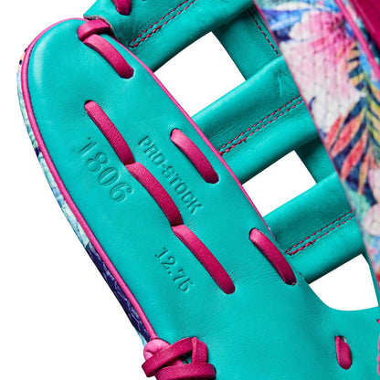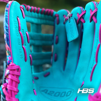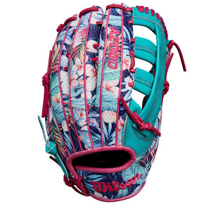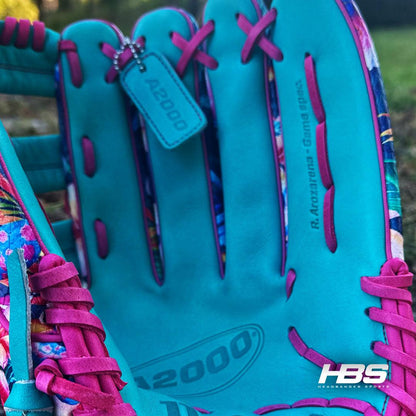 Match the coolest player on the field while making jaw-dropping catches at the wall with Randy Arozarena’s A2000® RA56 Game Model glove. Featuring SuperSnakeSkin™ decorated in a floral print, Arozarena’s A2000 delivers a lightweight feel and tropical vibe. This 12.75” outfield glove, based on the A2000 1806, has a Teal Pro Stock® leather palm for long-lasting performance. Blossoming high school and college outfielders can leverage the Single Post & Double Bar Web to rob home runs like Randy in the Pacific Northwest.